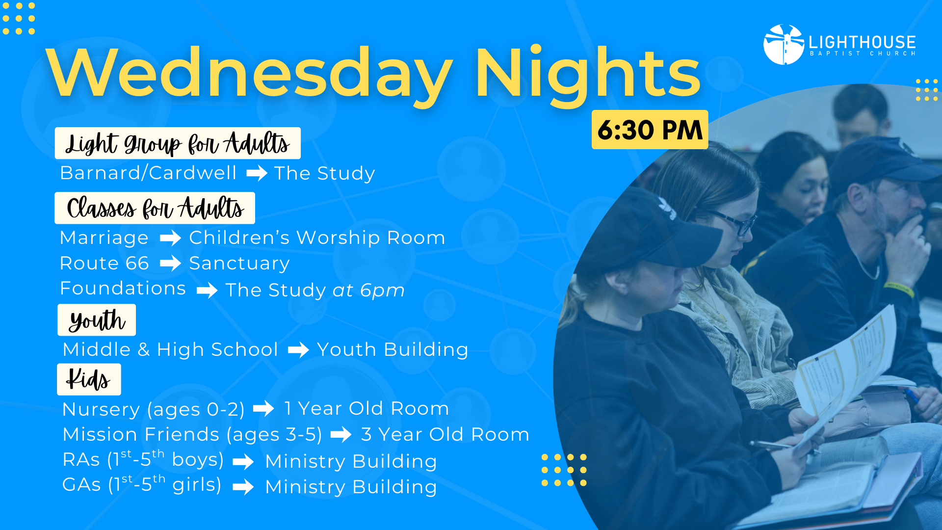 Welcome to Wednesday Night Classes. Join us every Wednesday as we closely examine God’s Word and how it applies to every area of our lives. These classes are for all ages and are designed for you to build relationships with other Christians interested in similar things or in a similar stage of life.